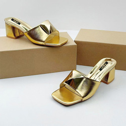 Xuanhui 2025 Zomer Nieuwe Stijl Mode Vierkant Open Teen Slide Metalen Gesp Dames Hoge Hak Slippers